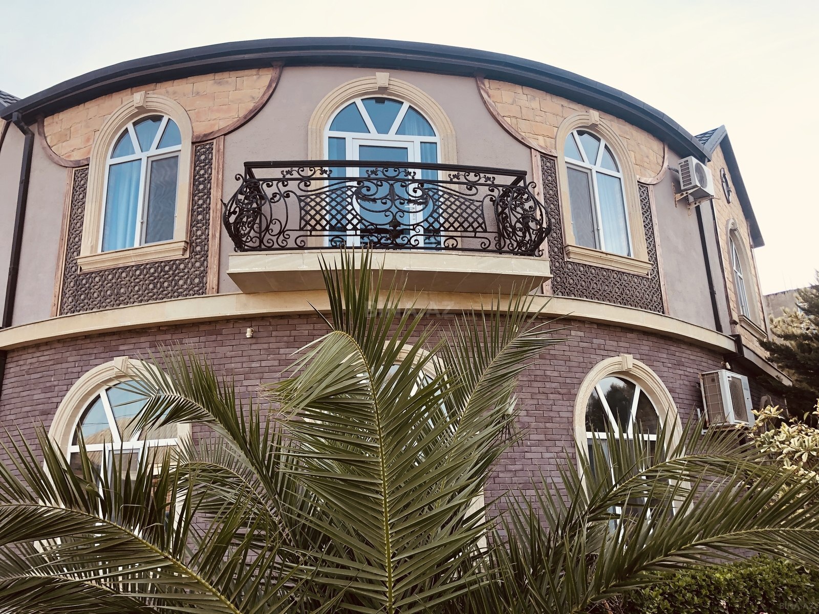- Ev fasadı: eyvanlı giriş, pilləkən, dekorativ sütunlar, plastik pəncərələr barmaqlıqlarla, peyk antenası quraşdırılıb.
